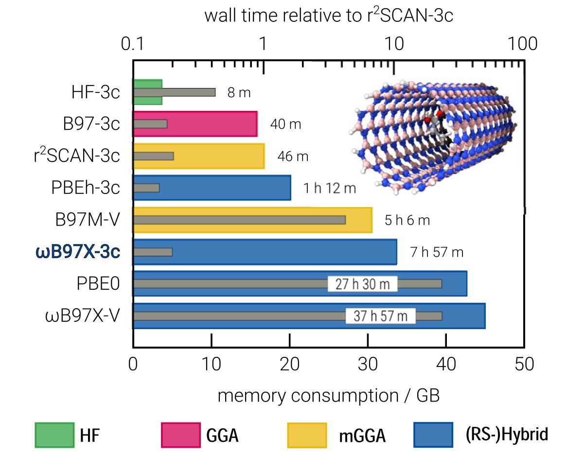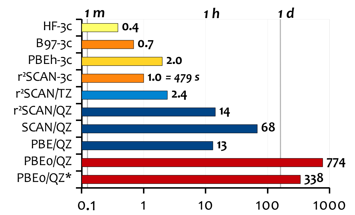 PBEh-3c, B97-3c, and r2 SCAN-3c, which are all roughly the same speed despite substantial differences. Of these, PBEh-3c seems like the slowest and least accurate, and I’d be tempted to use either of the others first, especially r2 SCAN-3c. (I’m curious about the tradeoffs that a mGGA functional has versus a GGA functional like B97-3c—are there pathological integration grid behaviors that B97-3c avoids? See Figure 6 here.)