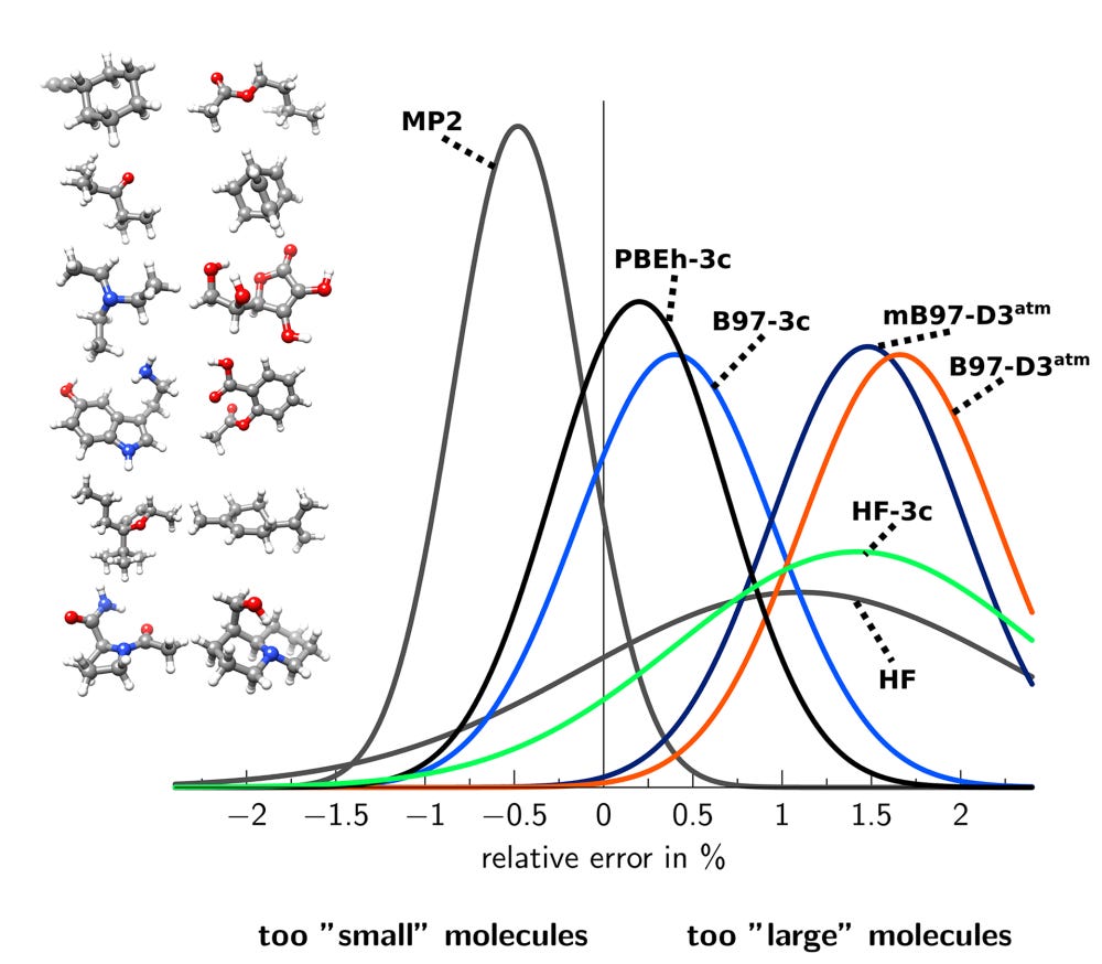 An important takeaway from this graph is that some regions of the Pareto frontier are easier to access than others. Within e.g. DFT, it’s relatively facile to tune the accuracy of the method employed, but it’s much harder to find a method intermediate between DFT and semiempirical methods. (For a variety of reasons that I’ll write about later, this region of the frontier seems particularly interesting to me, so it’s not just an intellectual question.) This lacuna is what Stefan Grimme’s “composite” methods, the subject of today’s post, are trying to address.