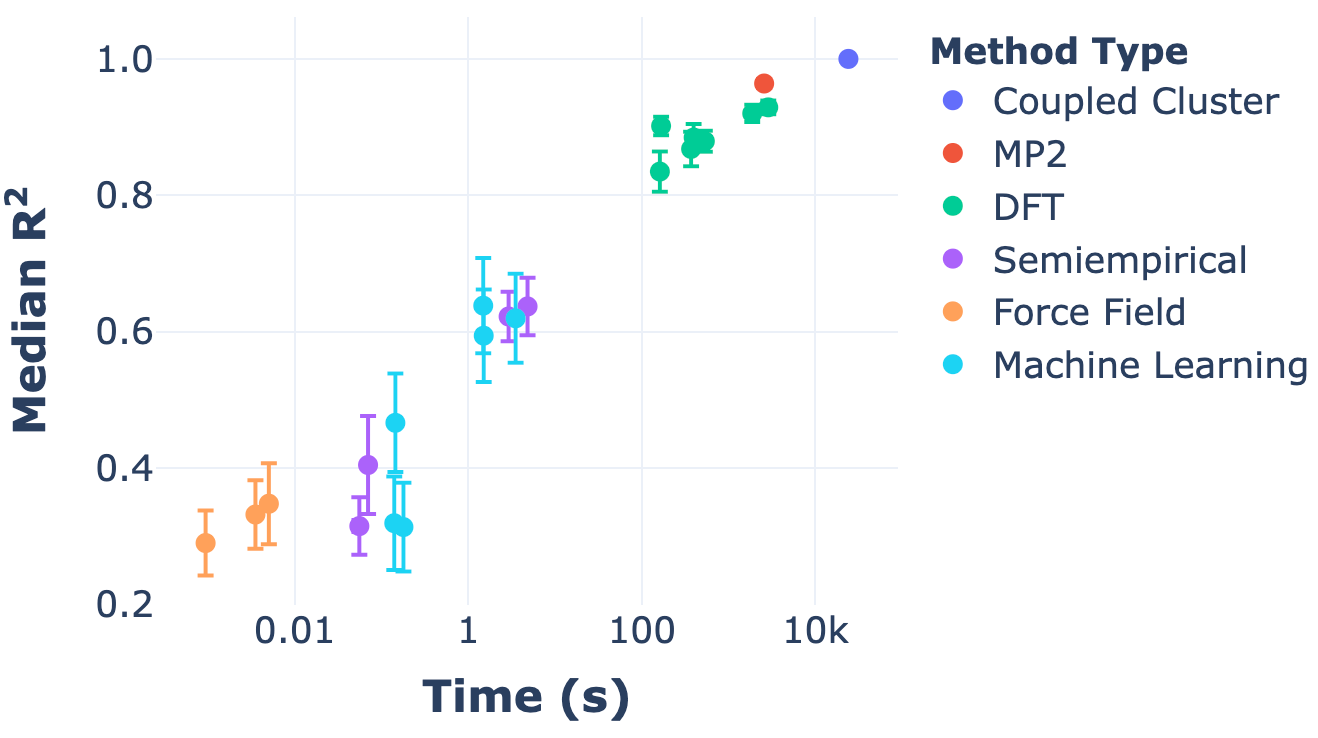 In this figure, the top left corner is the goal—perfect accuracy in no time at all—and the bottom right corner is the opposite. The diagonal line represents the Pareto frontier, and we can see that different levels of theory put you at different places along the frontier. Ab initio methods (DFT, MP2, coupled cluster) are slow but accurate, while force fields are fast but inaccurate, and semiempirical methods and ML methods are somewhere in the middle. (It’s interesting to observe that some ML methods are quite far from the optimal frontier, but I suppose that’s only to be expected from such a new field.)