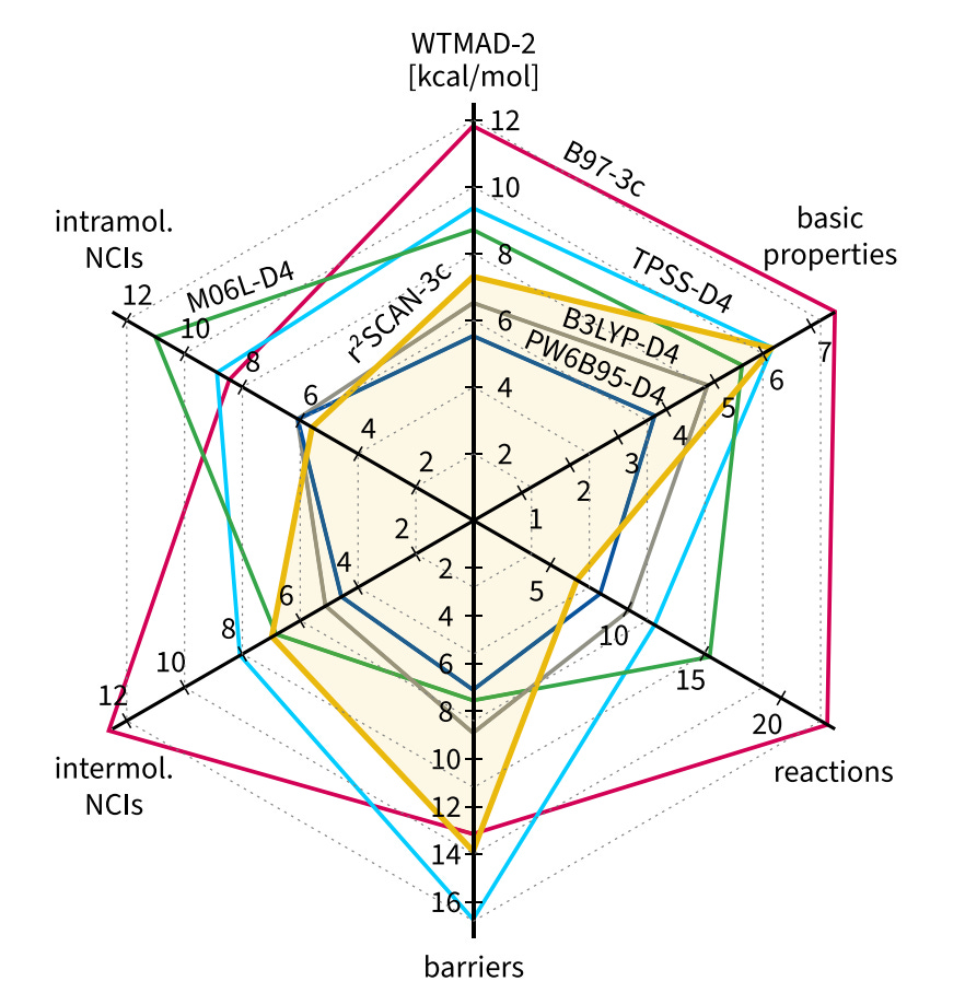 Continuing our journey through the “Jacob’s ladder” of composite functionals, we arrive at r2 SCAN-3c, based on the meta-GGA r2 SCAN functional. No reparameterization of the base functional is performed, but the D4 and gCP corrections are added, and yet another basis set is developed: mTZVPP, a variant of the mTZVP basis set developed for B97-3c, which was already a variant of def2-TZVP.